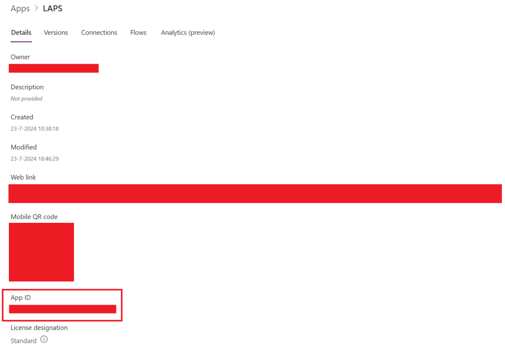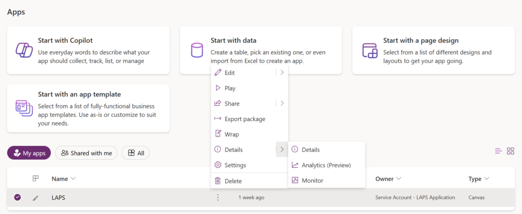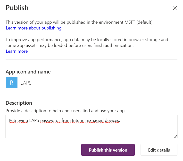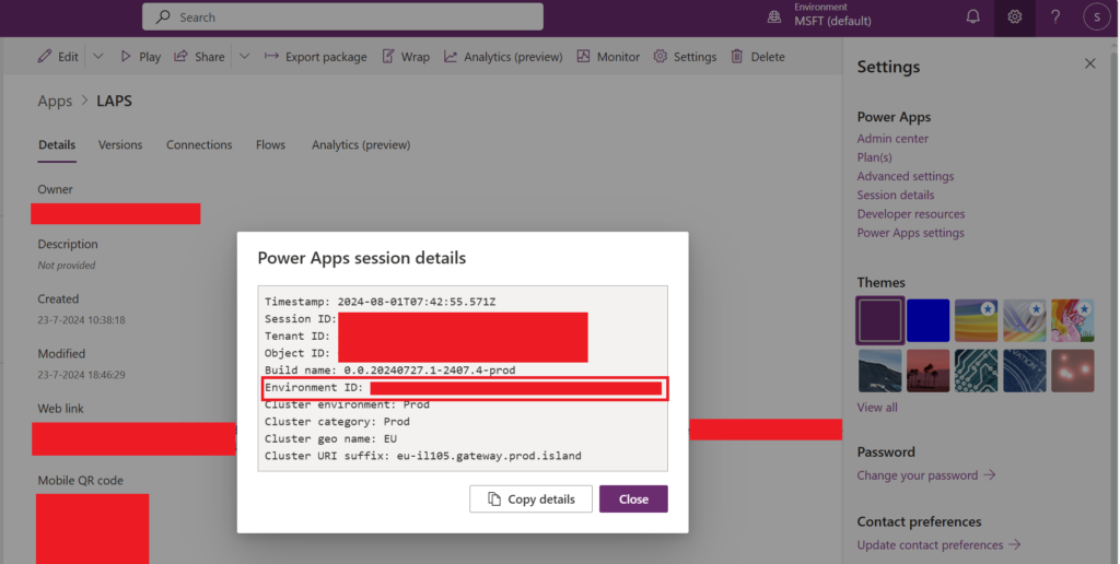 Wait until the PowerShell module is successfully installed. Now go back to Power Apps | Home –> Apps –> “LAPS” –> Details –> Details.