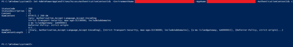 You can confirm this by running the Get-AdminPowerAppConditionalAccessAuthenticationContextIds -EnvironmentName {Insert Environment ID here} -AppName {Insert App ID here} command again.