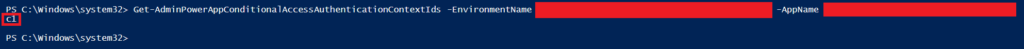 - Get-AdminPowerAppConditionalAccessAuthenticationContextIds -EnvironmentName {Insert Environment ID here} -AppName {Insert App ID here}