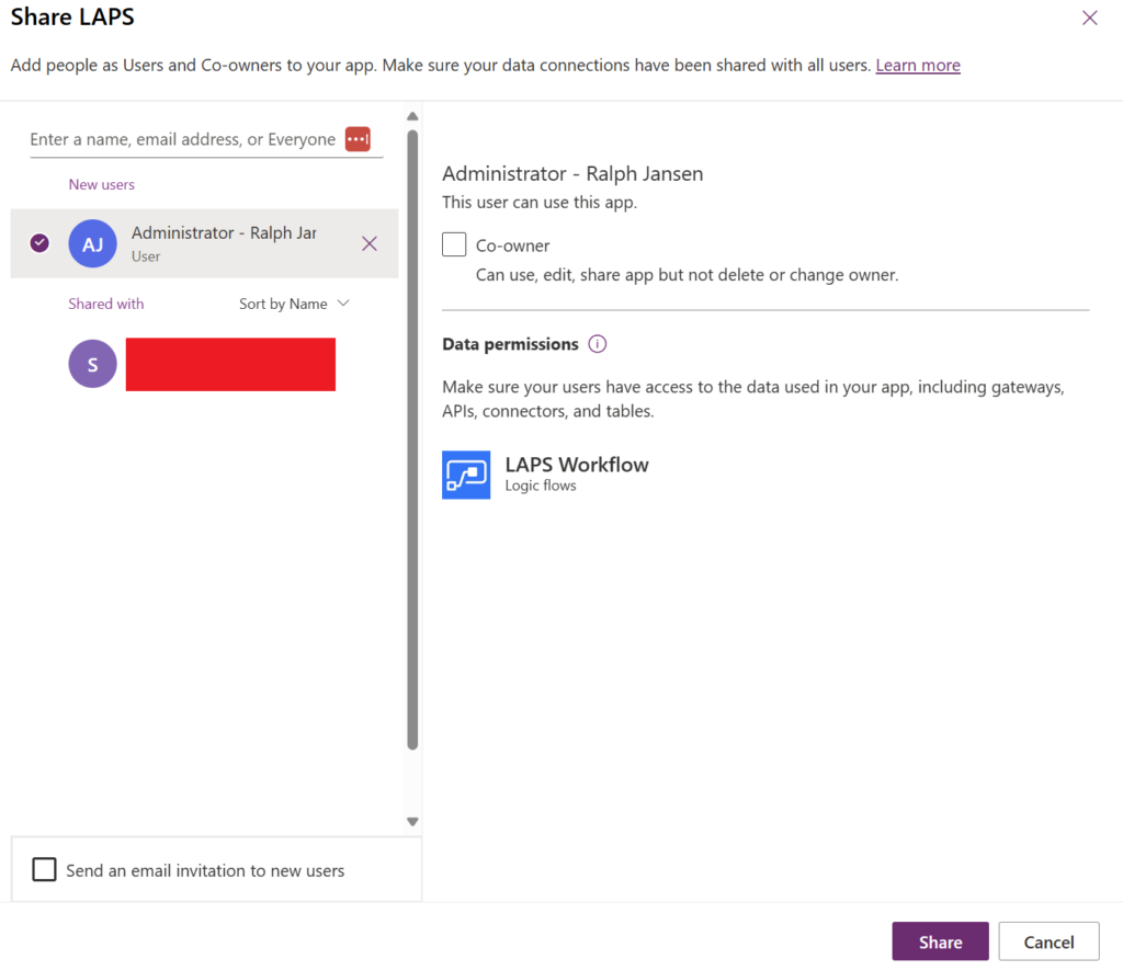 Enter a user or an Entra ID security group and press “Share”. The user(s) that have been added are able to access the canvas application now.
