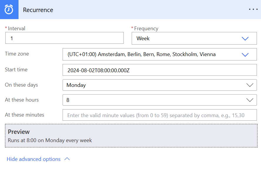 Your recurrence step should like this. My flow will run every week at 8 AM on Monday.