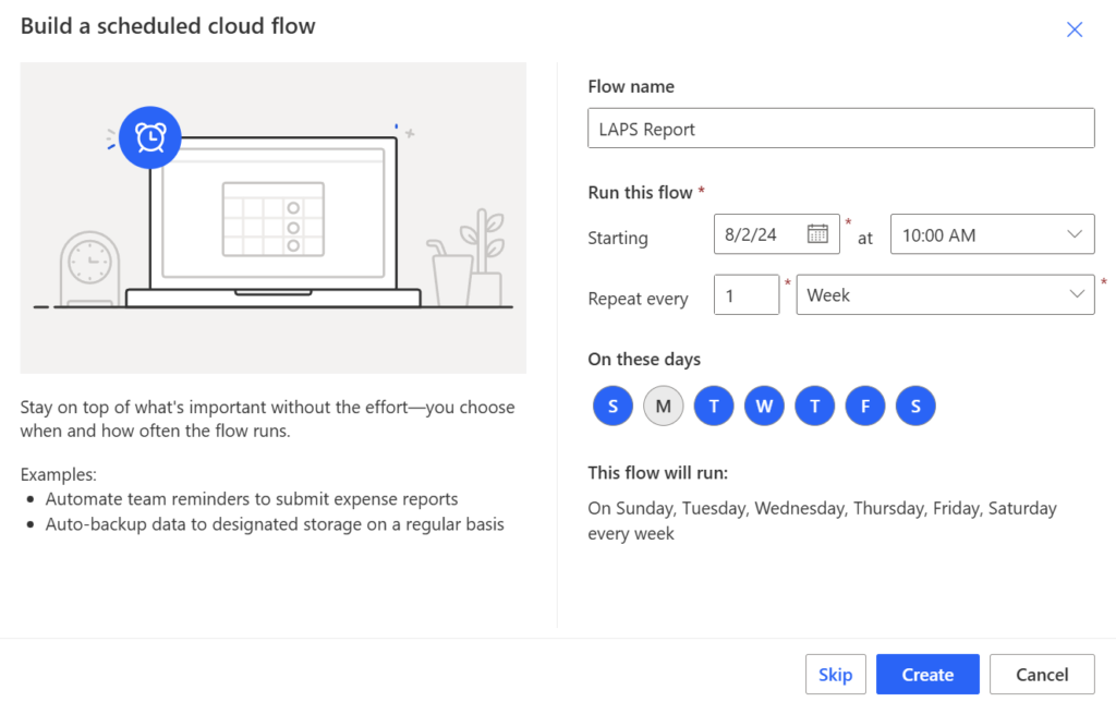 Give your flow a name. I will name it “LAPS Report”. Select when it starts, how many times it repeats and at which day it starts. In my case, I will go with once a week on Monday. Press “Create”.