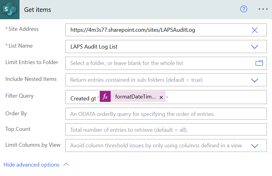 Add a new step “Get items” from SharePoint Online and select “Show advanced options”.