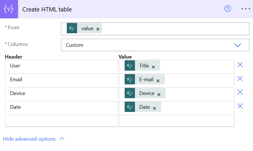 Add a new step “Create HTML table”.