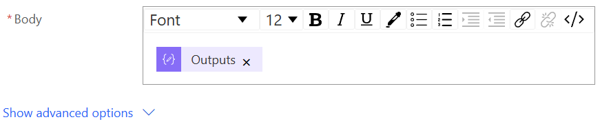 Select “Outputs” from Compose and add that into the body of the e-mail.