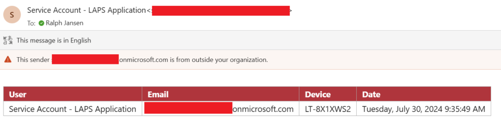 And there we are… Successfully received an e-mail with whom requested a LAPS password for a device at which date.